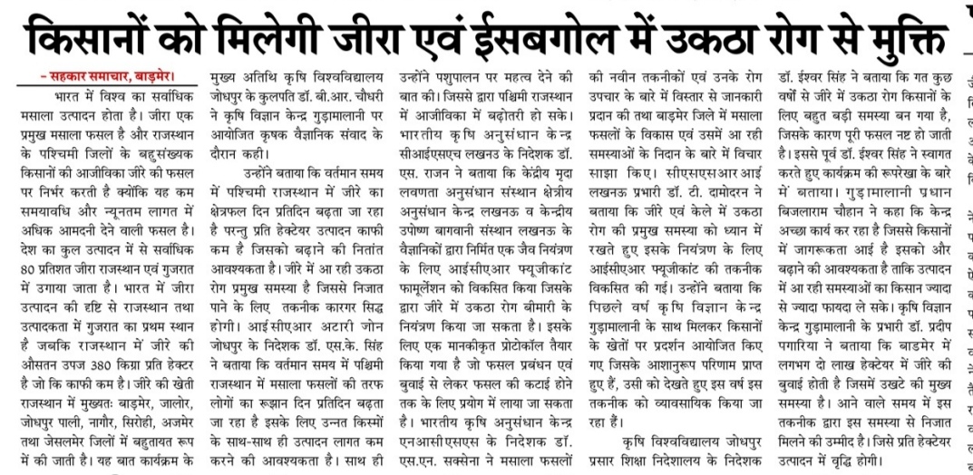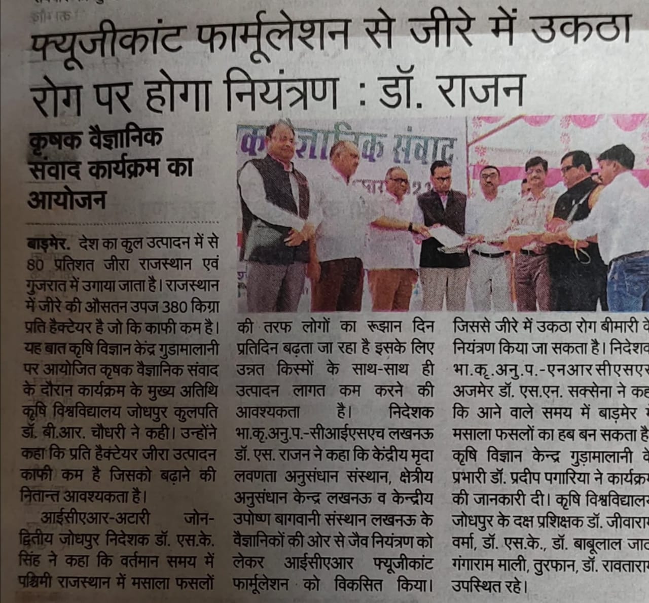 “ICAR-Fusicont” biological technology developed by ICAR Our country India is known as the largest producer of spices in the world. Similarly, India is also a leader in the production of cumin crop. In India, cumin is mainly grown in Gujarat and Rajasthan.For the last few years, cumin growers have been suffering from the fungal disease of cumin crop, locally known as 'Uktha', which is caused by the fungus Fusorium oxysporum cumenai. Due to this fungus, the symptoms of Fusarium Wilt disease appear within 30-40 days after planting, the roots of diseased plants dry out and gradually turn yellow and over time such diseased plants wither away. This fungal disease causes severe damage to cumin crop.